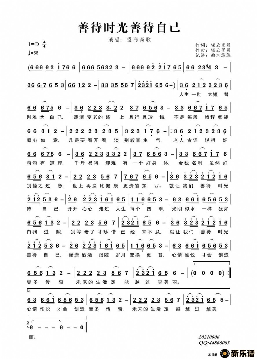 善待时光善待自己望海高歌 望海高歌演唱的善待时光善待自己歌词,善待时光善待自己简谱. 人生一世太短暂别难为自己逐渐变老的路上且行且珍惜不是每段旅程都能顺心如意凡是要看开看淡别较真生气老人古语说得好句句有道理千斤易得却难有一个好身体金钱名利虽然好别操之过急世上再没比健康更贵的东西就让我们善待时光善待自己开开心心走过人生每个四季光阴似水一样犹如白驹过隙别等老了才珍惜已经来不及就让我们善待时光善待自己潇潇洒洒跟随岁月变换更替心情愉悦才会创造更多传奇未来的生活定能越过越美丽老人古语说得好句句有道理千斤易得却难有一个好身体金钱名利虽然好别操之过急世上再没比健康更贵的东西就让我们善待时光善待自己开开心心走过人生每个四季光阴似水一样犹如白驹过隙别等老了才珍惜已经来不及就让我们善待时光善待自己潇潇洒洒跟随岁月变换更替心情愉悦才会创造更多传奇未来的生活定能越过越美丽心情愉悦才会创造更多传奇未来的生活定能越过越美丽 此简谱由新乐谱会员 曲水悠悠 上传