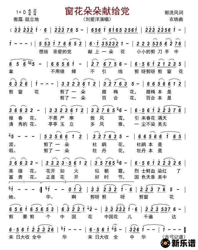 刘爱洋演唱的窗花朵朵献给党歌词,窗花朵朵献给党简谱.