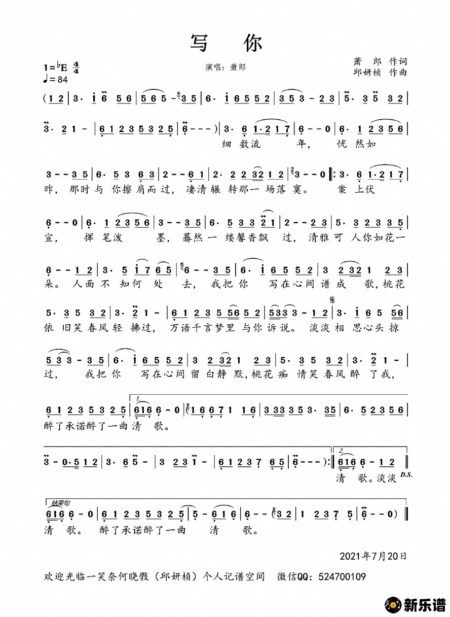 萧郎演唱的写你(男版)歌词,写你(男版)简谱.