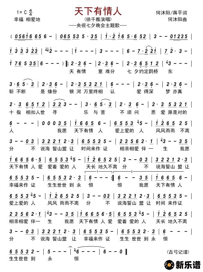 徐千雅演唱的天下有情人(央视七夕主题歌)歌词,天下有情人(央视七夕主题歌)简谱.