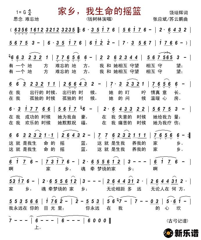 《家乡,我生命的摇篮》简谱 钱树林-古弓制谱