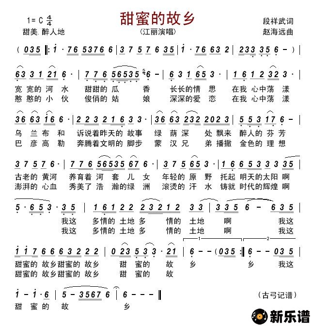 《甜蜜的故乡》简谱 江丽-古弓制谱