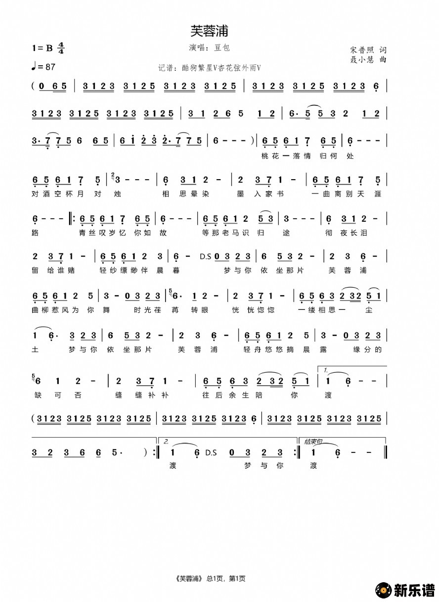 豆包演唱的芙蓉浦歌词,芙蓉浦简谱.