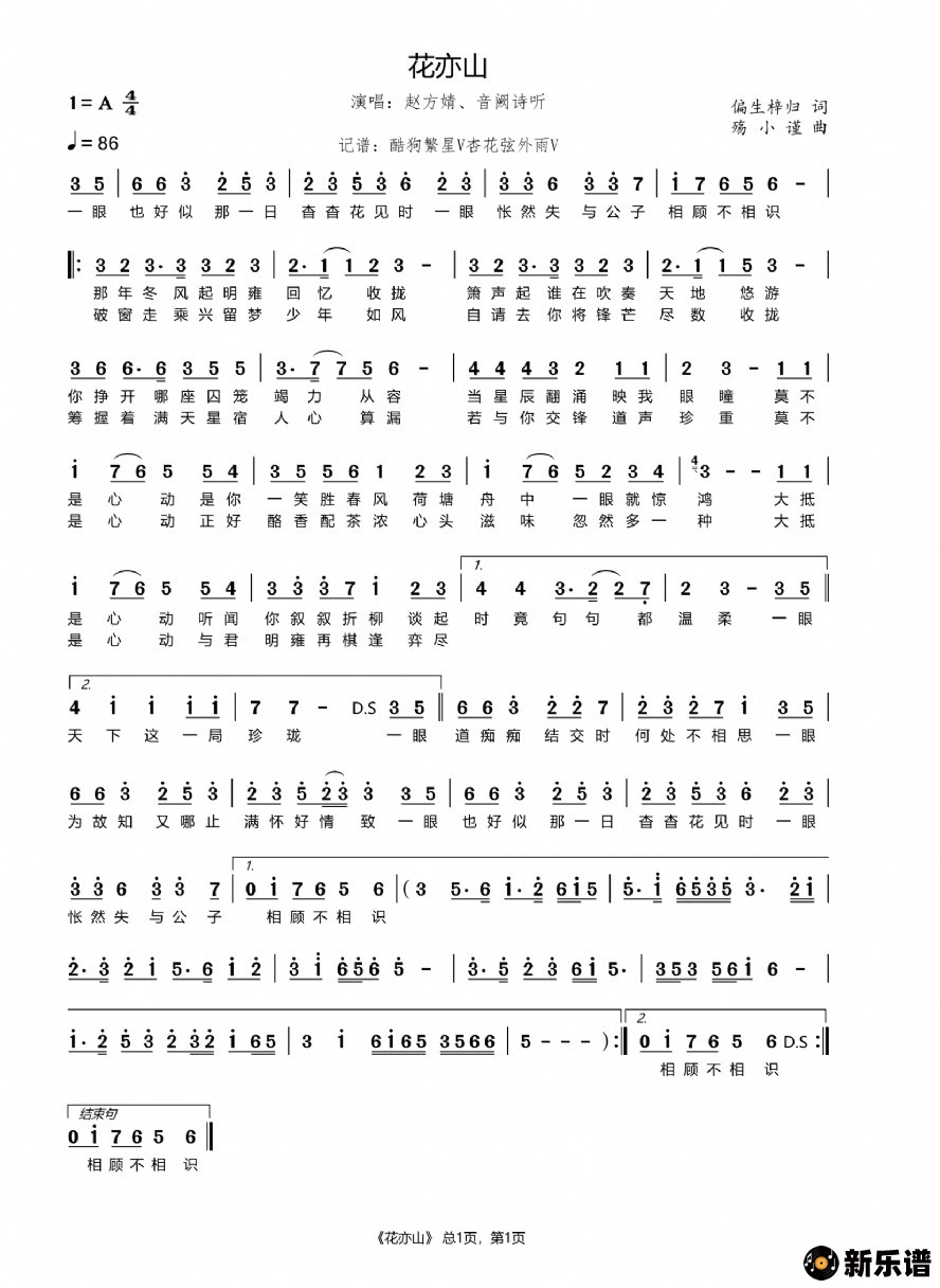 音阙诗听、赵方婧演唱的花亦山歌词,花亦山简谱.