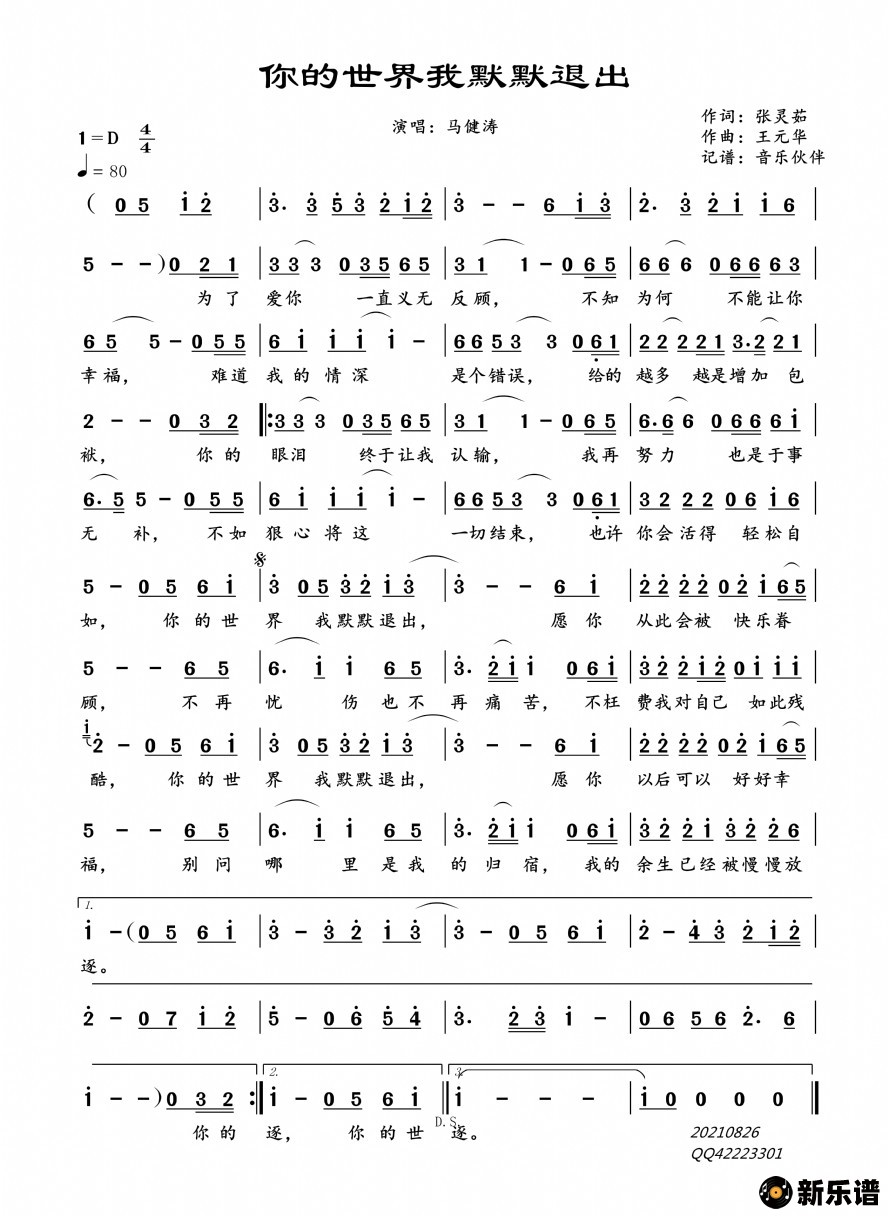 你的世界我默默退出马健涛 马健涛演唱的你的世界我默默退出歌词,你的世界我默默退出简谱. 为了爱你一直义无反顾不知为何不能让你幸福难道我的情深是个错误给的越多越是增加包袱你的眼泪终于让我认输我再努力也是于事无补不如狠心将这一切结束也许你会活得轻松自如你的世界我默默退出愿你从此会被快乐眷顾不再忧伤也不再痛苦不枉费我对自己如此残酷你的世界我默默退出愿你以后可以好好幸福别问哪里是我的归宿我的余生已经被慢慢放逐你的眼泪终于让我认输我再努力也是于事无补不如狠心将这一切结束也许你会活得轻松自如你的世界我默默退出愿你从此会被快乐眷顾不再忧伤也不再痛苦不枉费我对自己如此残酷你的世界我默默退出愿你以后可以好好幸福别问哪里是我的归宿我的余生已经被慢慢放逐你的世界我默默退出愿你从此会被快乐眷顾不再忧伤也不再痛苦不枉费我对自己如此残酷你的世界我默默退出愿你以后可以好好幸福别问哪里是我的归宿我的余生已经被慢慢放逐 此简谱由新乐谱会员 音乐伙伴 上传