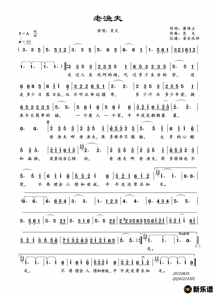笑天演唱的老渔夫歌词,老渔夫简谱.