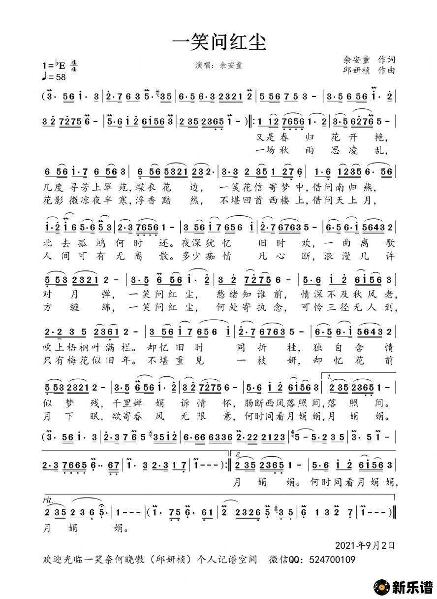 一笑问红尘(男版)余安童 余安童演唱的一笑问红尘(男版)歌词,一笑问红尘(男版)简谱. 又是春归花开艳几度寻芳上翠苑蝶依花边一笺花信寄梦中借问南归燕北去孤鸿何时还夜深犹忆旧时欢一曲离歌对月弹一笑问红尘愁绪知谁前情深不及秋风老吹上梧桐叶满栏却忆旧时同折桂独自含情似梦残千里婵娟诉情怀肠断西风落照间落照间........................一场秋雨思凌乱花影微凉夜半寒浮香黯然不堪回首西楼上借问天上月人间可有无离散多少痴情凡心断浪漫几许方缠绵一笑问红尘何处寄执念可怜三径无人到只有梅花似旧年不堪重见一枝妍却忆花前月下眠欲寄春风无限意何时同看月娟娟月娟娟何时同看月娟娟月娟娟 此简谱由新乐谱会员 一笑奈何晓斅 上传