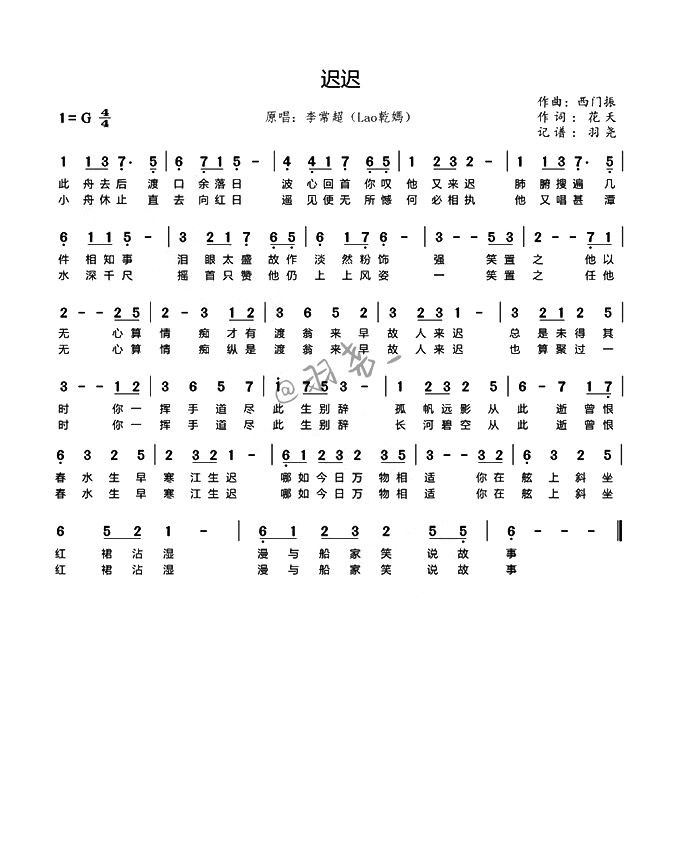 《迟迟》简谱 李常超(Lao乾媽)-羽尧制谱
