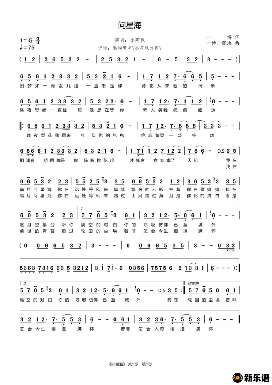 小阿枫演唱的问星海歌词,问星海简谱.