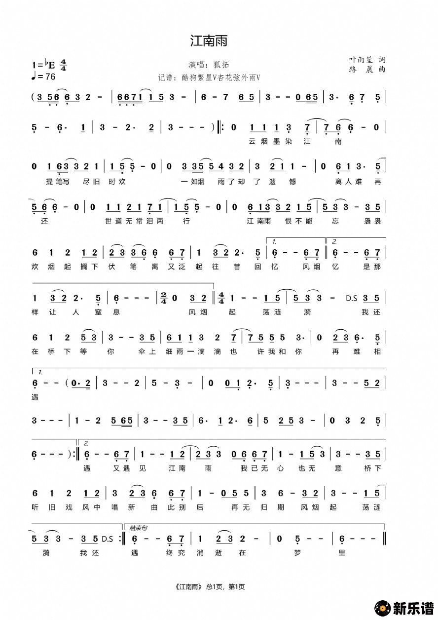 《江南雨》简谱 狐拓-杏花弦外雨制谱