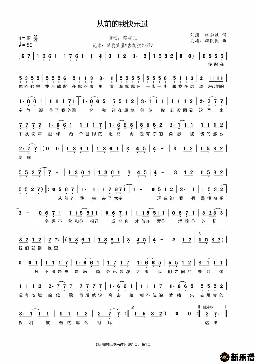 从前的我快乐过蒋雪儿 蒋雪儿演唱的从前的我快乐过歌词,从前的我快乐过简谱. 你留在我的心里我不能留在你的眼里看着你现在一步一步跟我在远离淋过雨的空气潮湿了我的回忆我还在原地等你你却没回到这里来不及说声爱你两个世界的距离再没有你的消息被伤的那么彻底阴沉的天角落里还留着你的照片极度困倦闭上双眼控制不住的泪腺一个人的房间没有你不敢想活在一个人的明天没有你不敢想你从不知道我在夜里辗转多少次那封未寄出的信我写了多少字把自己封闭就快要窒息我原谅不了自己怎能忘记你 当初为何放弃你从前的我 失去了太多现在的我 假装很快乐多想不曾和你相遇成全你才放弃爱你埋葬你的一切 我们就到这里分不出是爱是病窗外已瓢泼大雨我们之间的关系像没有地址的信散场后就该离去控制不住的情绪失去想你的权利被伤的那么彻底从前的我 失去了太多现在的我 不需要快乐多想不曾和你相遇成全你才放弃爱你埋葬你的一切 我们就到这里阴沉的天角落里还留着你的照片极度困倦闭上双眼控制不住的泪腺一个人的房间没有你不敢想活在一个人的明天没有你从前的我 失去了太多现在的我 为自己而活多想不曾和你相遇成全你才放弃爱你埋葬你的一切 我们就到这里 此简谱由新乐谱会员 杏花弦外雨 上传