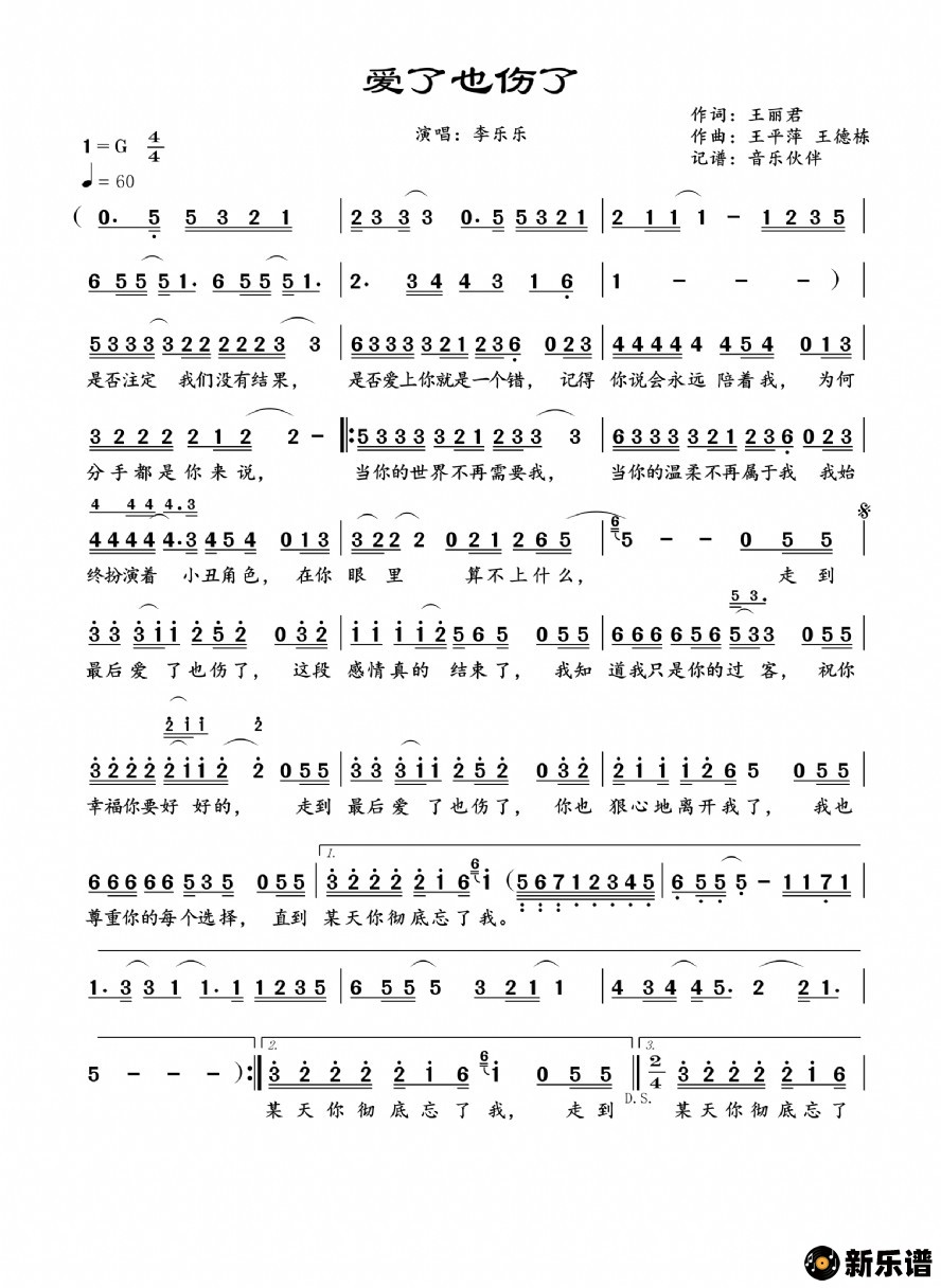 李乐乐演唱的爱了也伤了歌词,爱了也伤了简谱.