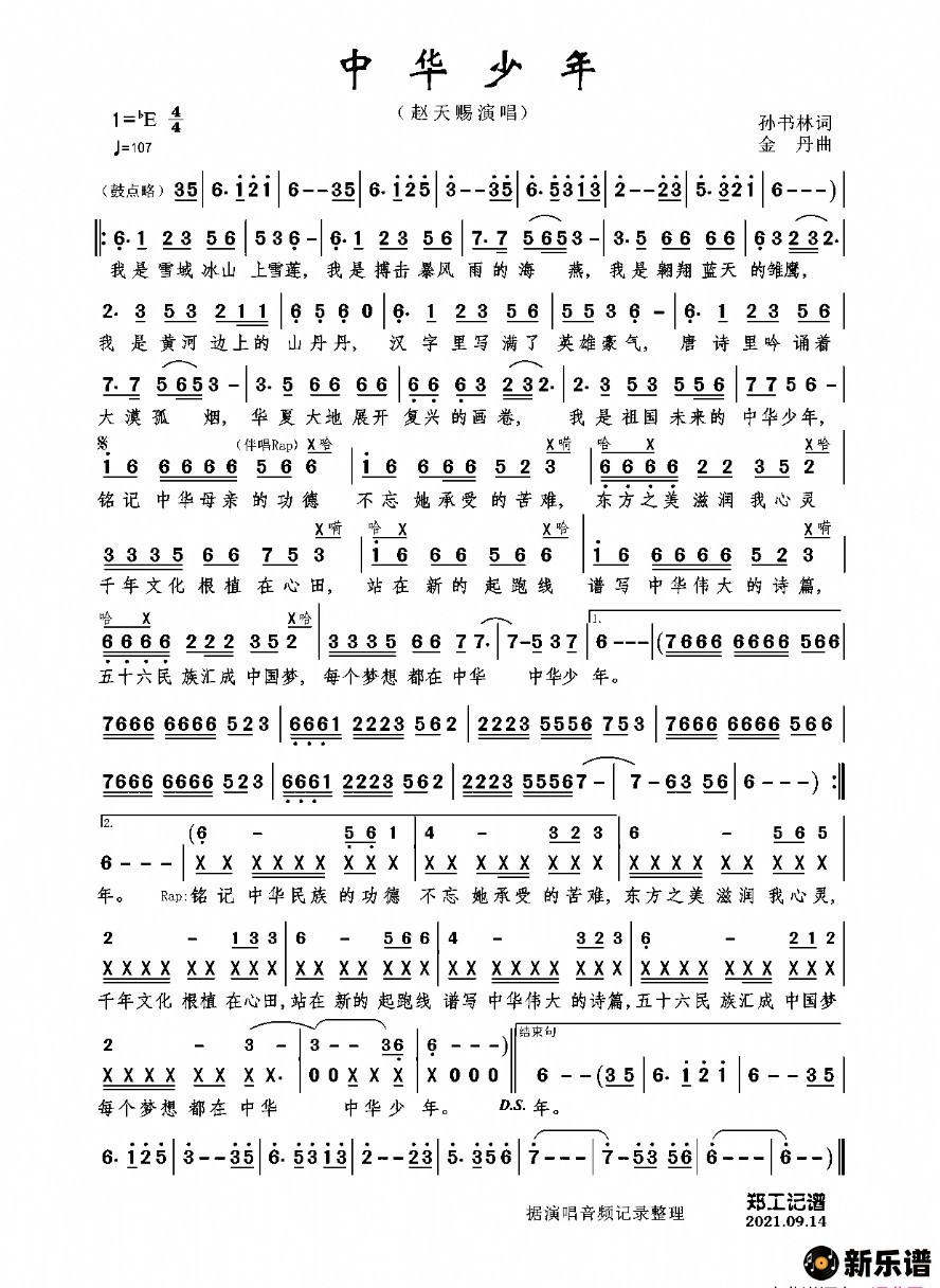 赵天赐演唱的中华少年歌词,中华少年简谱.