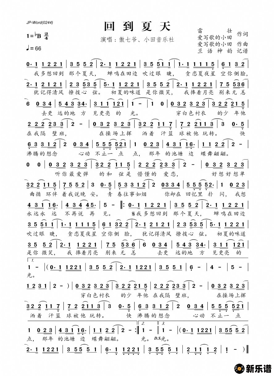 《回到夏天》简谱 傲七爷-兰语神韵制谱