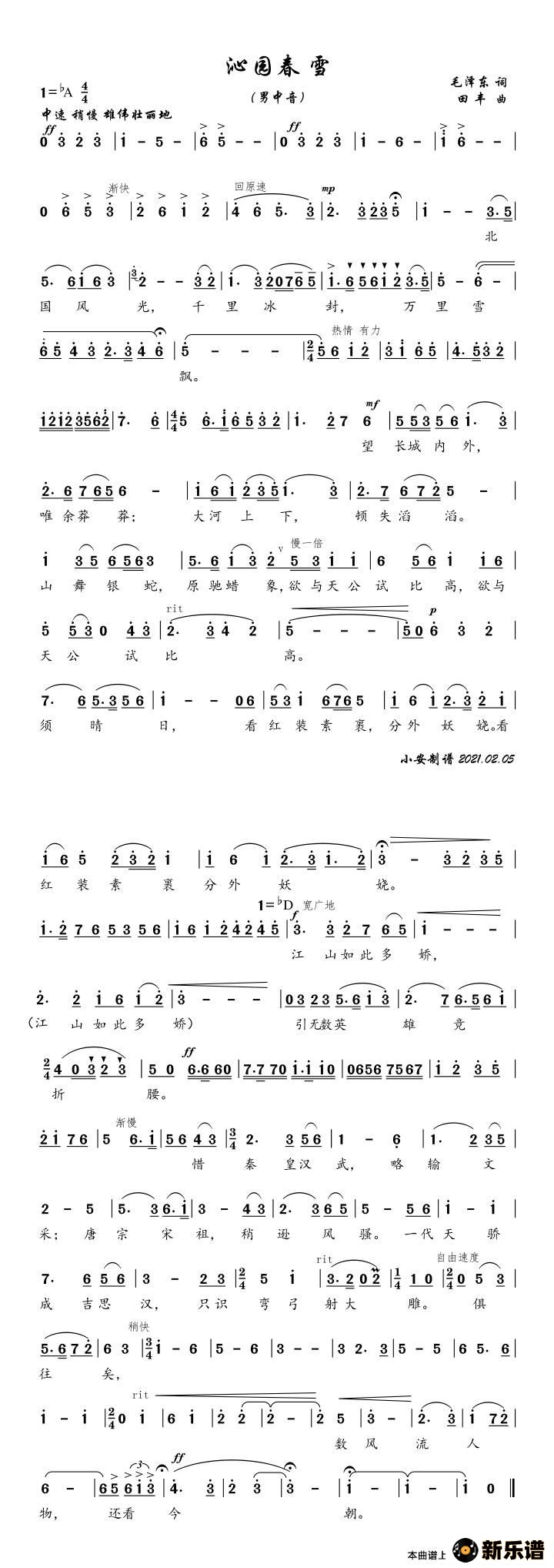 作词:毛泽东 作曲:田丰(简谱 男中音 田丰 廖昌永 刘秉义 魏松)