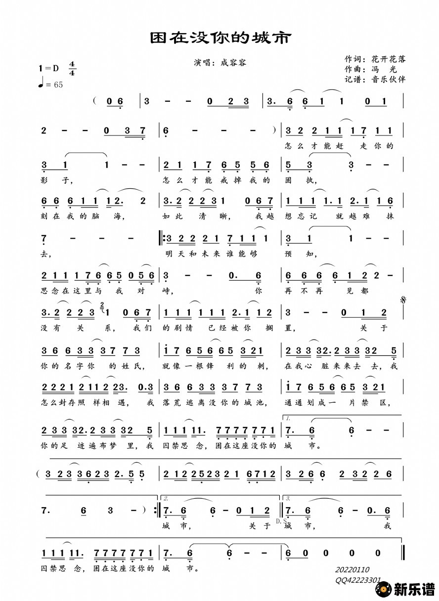 成容容演唱的困在没你的城市歌词,困在没你的城市简谱.