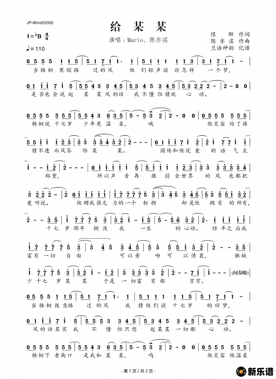 Mario、陈亦洺演唱的给某某歌词,给某某简谱.