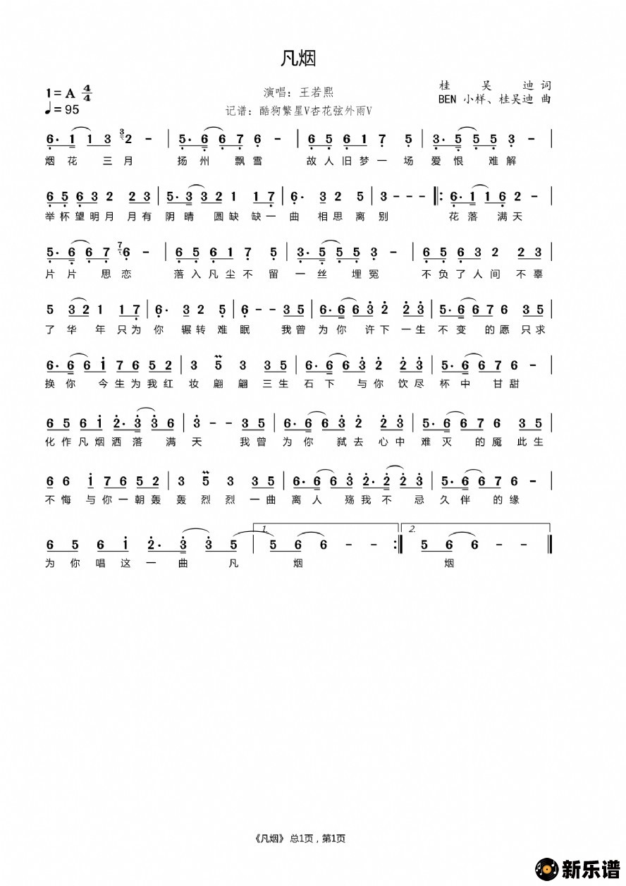 王若熙演唱的凡烟歌词,凡烟简谱.