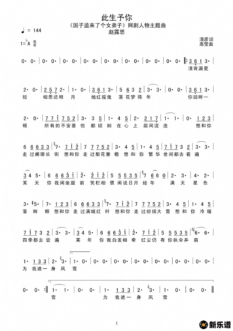 赵露思演唱的此生予你歌词,此生予你简谱.