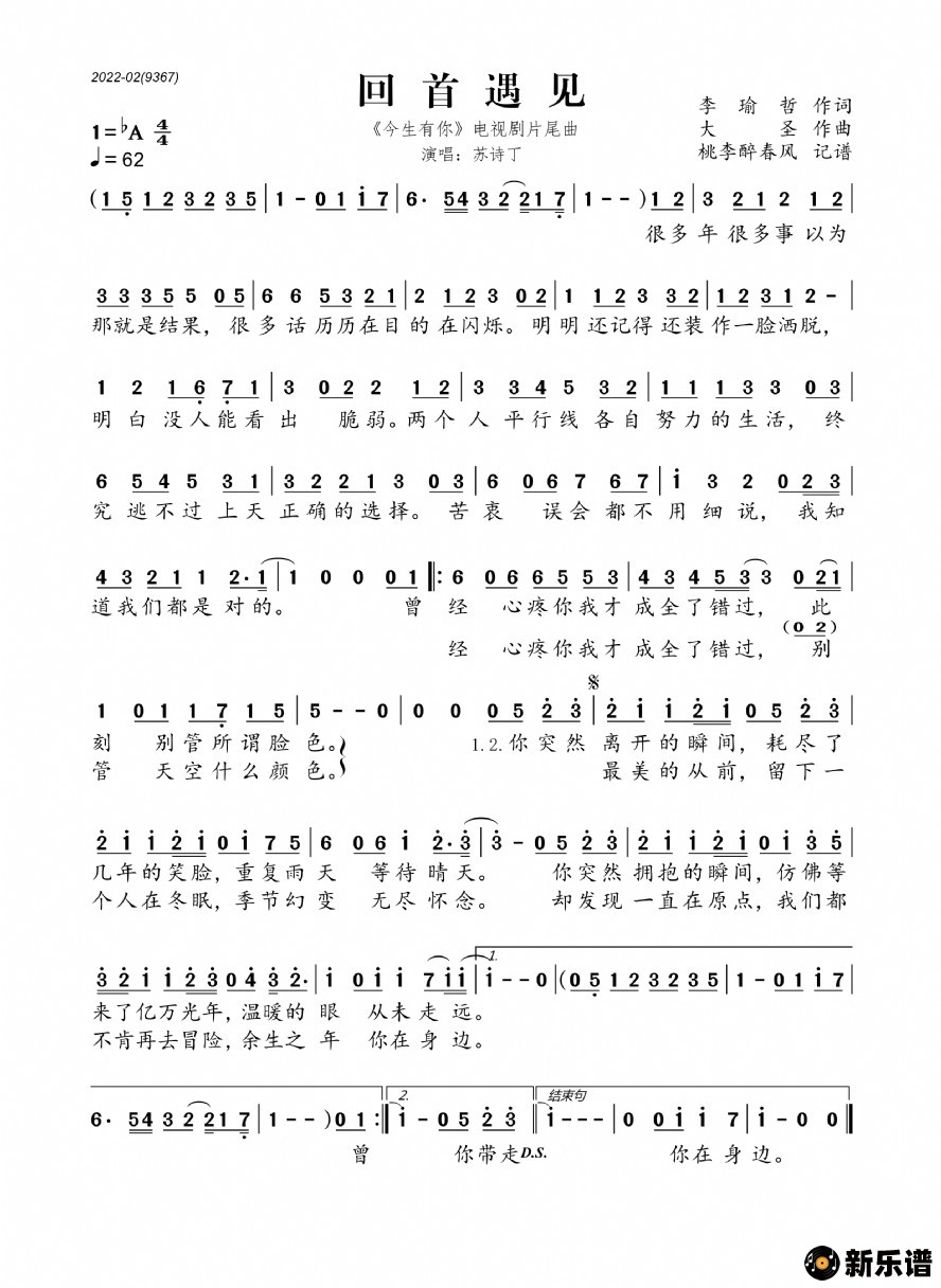 苏诗丁演唱的回首遇见歌词,回首遇见简谱.