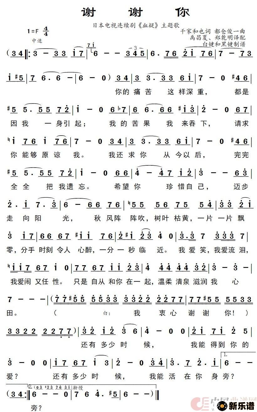 【日】感谢你(电视剧《血疑》主题歌)最新曲谱