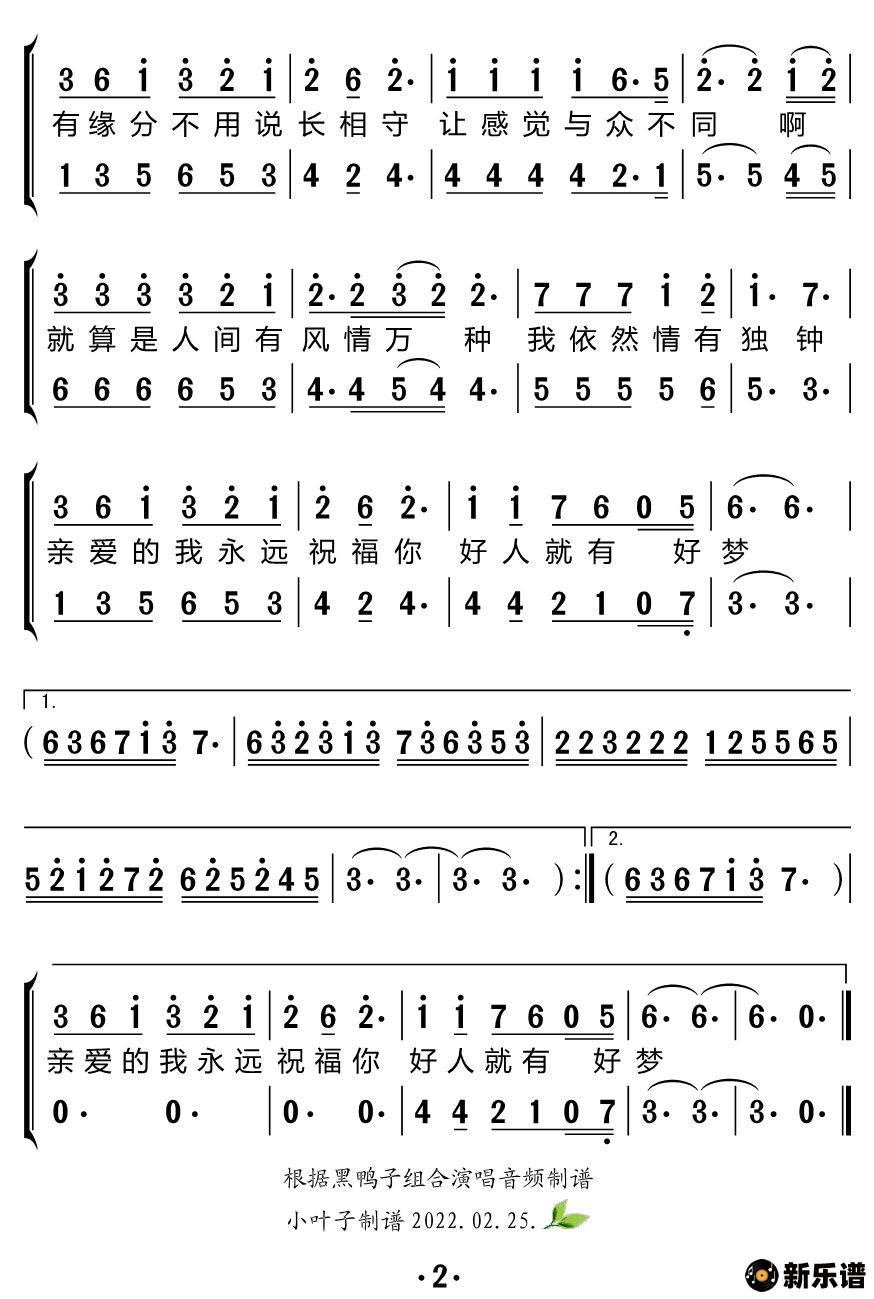 《好人好梦(合唱谱)》简谱 黑鸭子组合-小叶子制谱