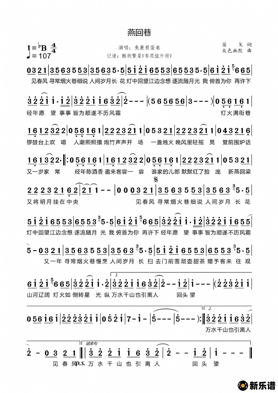 兔裹煎蛋卷演唱的燕回巷歌词,燕回巷简谱.