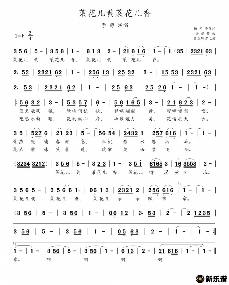 《菜花儿黄菜花儿香》简谱 李静-蓦然回首制谱