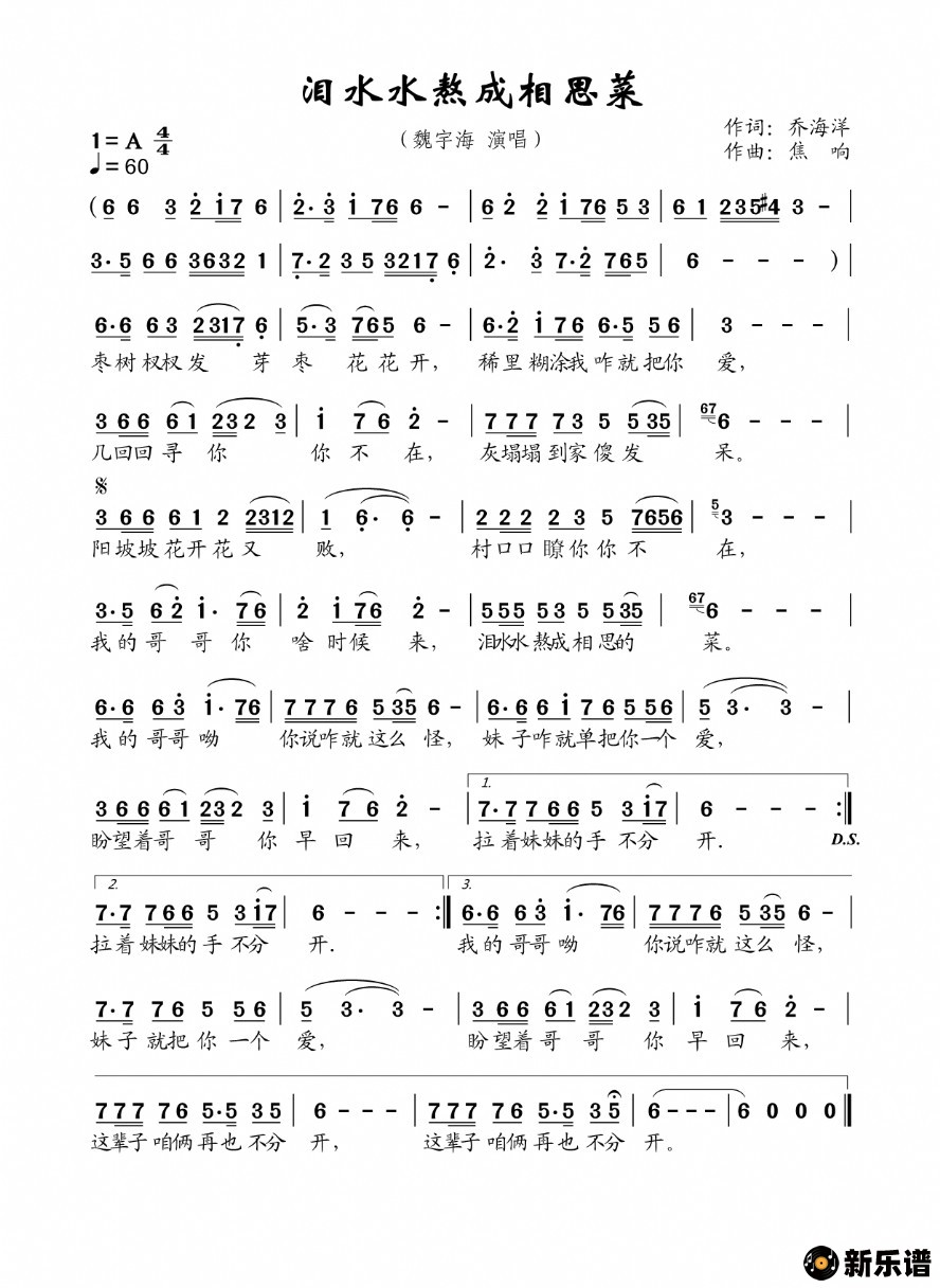 魏宇海演唱的泪水水熬成相思菜歌词,泪水水熬成相思菜简谱.