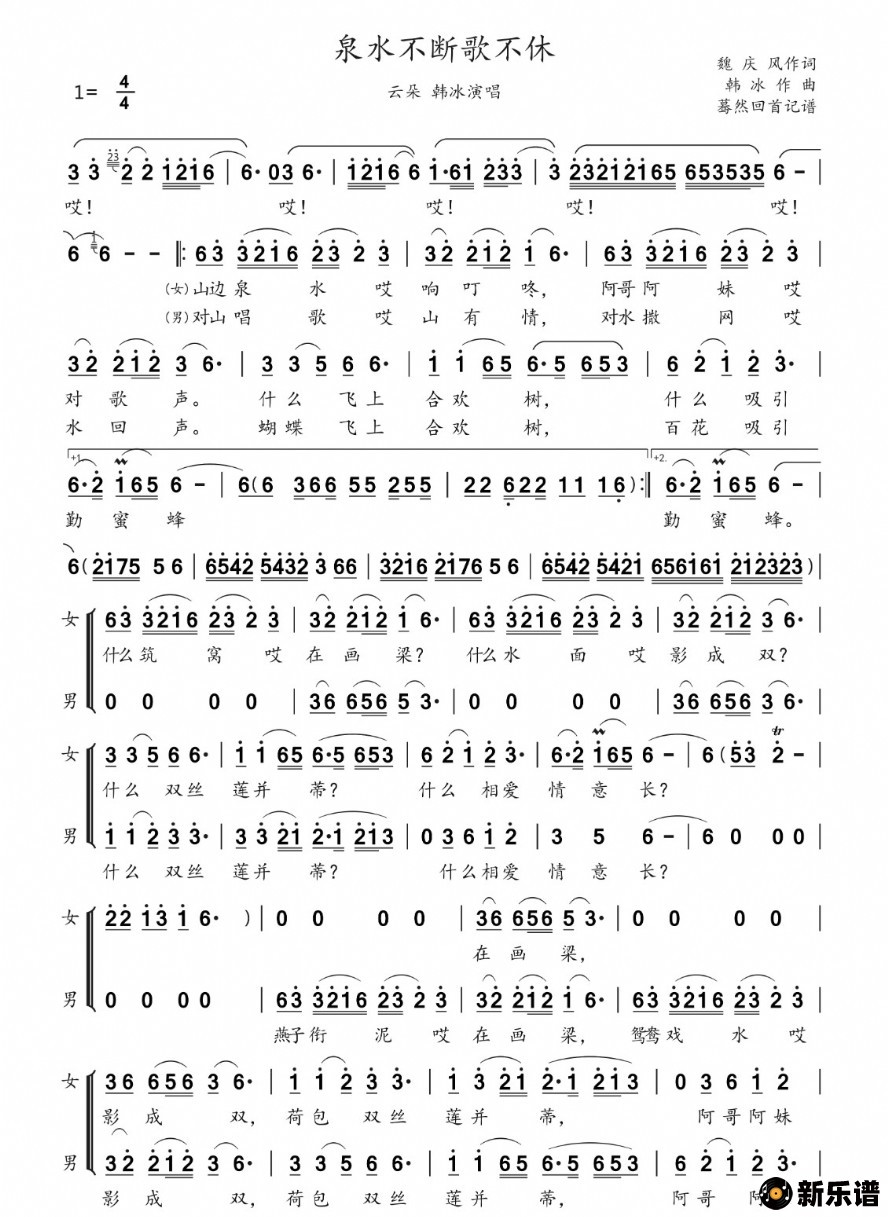 云朵/韩冰演唱的泉水不断歌不休歌词,泉水不断歌不休简谱.
