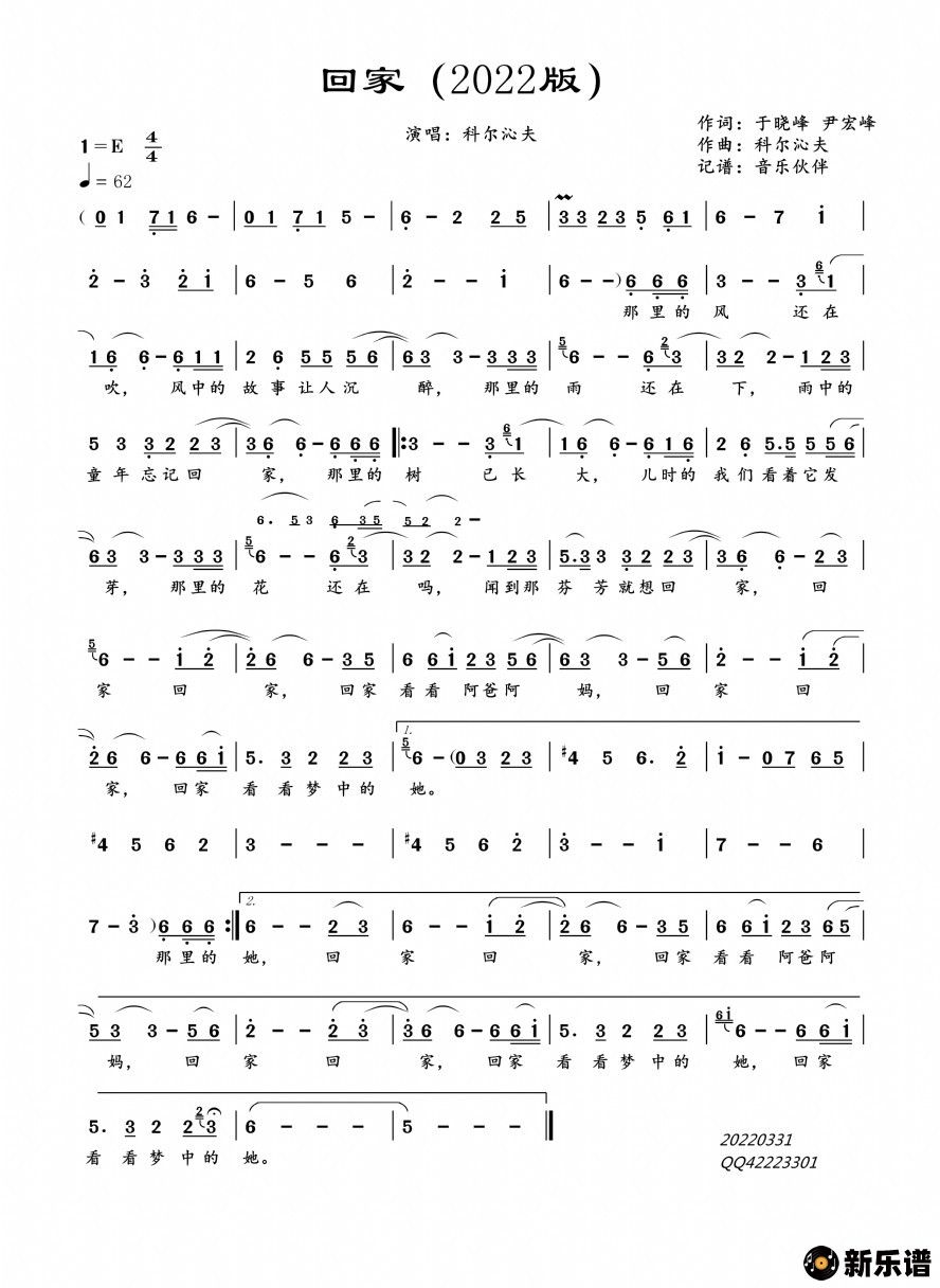 《回家2022版》简谱 科尔沁夫-音乐伙伴制谱