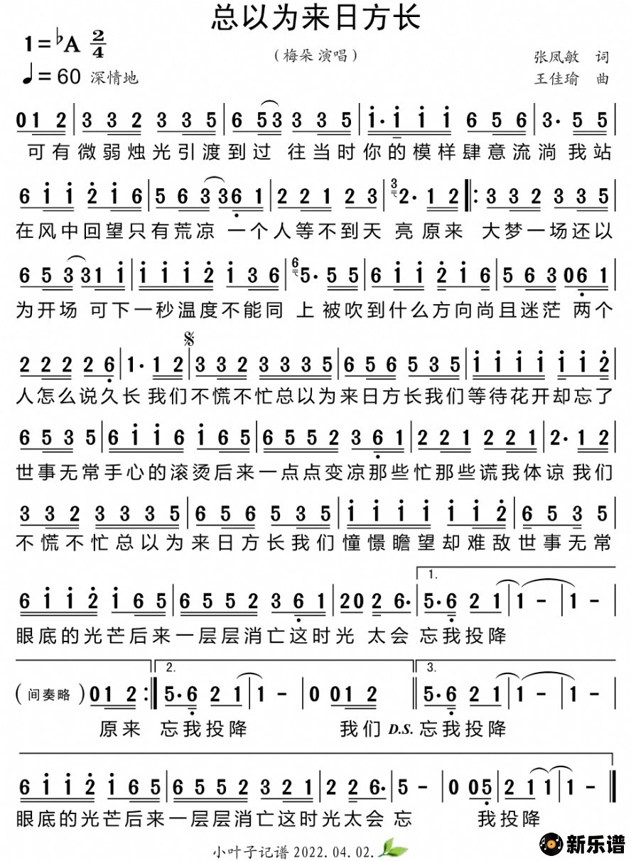 总以为来日方长梅朵 梅朵演唱的总以为来日方长歌词,总以为来日方长简谱. 可有微弱烛光 引渡到过往当时你的模样 肆意流淌我站在风中回望 只有荒凉一个人 等不到 天亮原来大梦一场 还以为开场可下一秒温度 不能同上被吹到什么方向 尚且迷茫两个人 怎么说 久长我们不慌不忙 总以为来日方长我们等待花开 却忘了世事无常手心的滚烫 后来一点点变凉那些忙 那些谎 我体谅我们不慌不忙 总以为来日方长我们憧憬瞻望 却难敌世事无常眼底的光芒 后来一层层消亡这时光 太会忘 我投降原来大梦一场 还以为开场可下一秒温度 不能同上被吹到什么方向 尚且迷茫两个人 怎么说 久长我们不慌不忙 总以为来日方长我们等待花开 却忘了世事无常手心的滚烫 后来一点点变凉那些忙 那些谎 我体谅我们不慌不忙 总以为来日方长我们憧憬瞻望 却难敌世事无常眼底的光芒 后来一层层消亡这时光 太会忘 我投降我们不慌不忙 总以为来日方长我们等待花开 却忘了世事无常手心的滚烫 后来一点点变凉那些忙 那些谎 我体谅我们不慌不忙 总以为来日方长我们憧憬瞻望 却难敌世事无常眼底的光芒 后来一层层消亡这时光 太会忘 我投降眼底的光芒 后来一层层消亡这时光 太会忘 我投降 此简谱由新乐谱会员 小叶子 上传