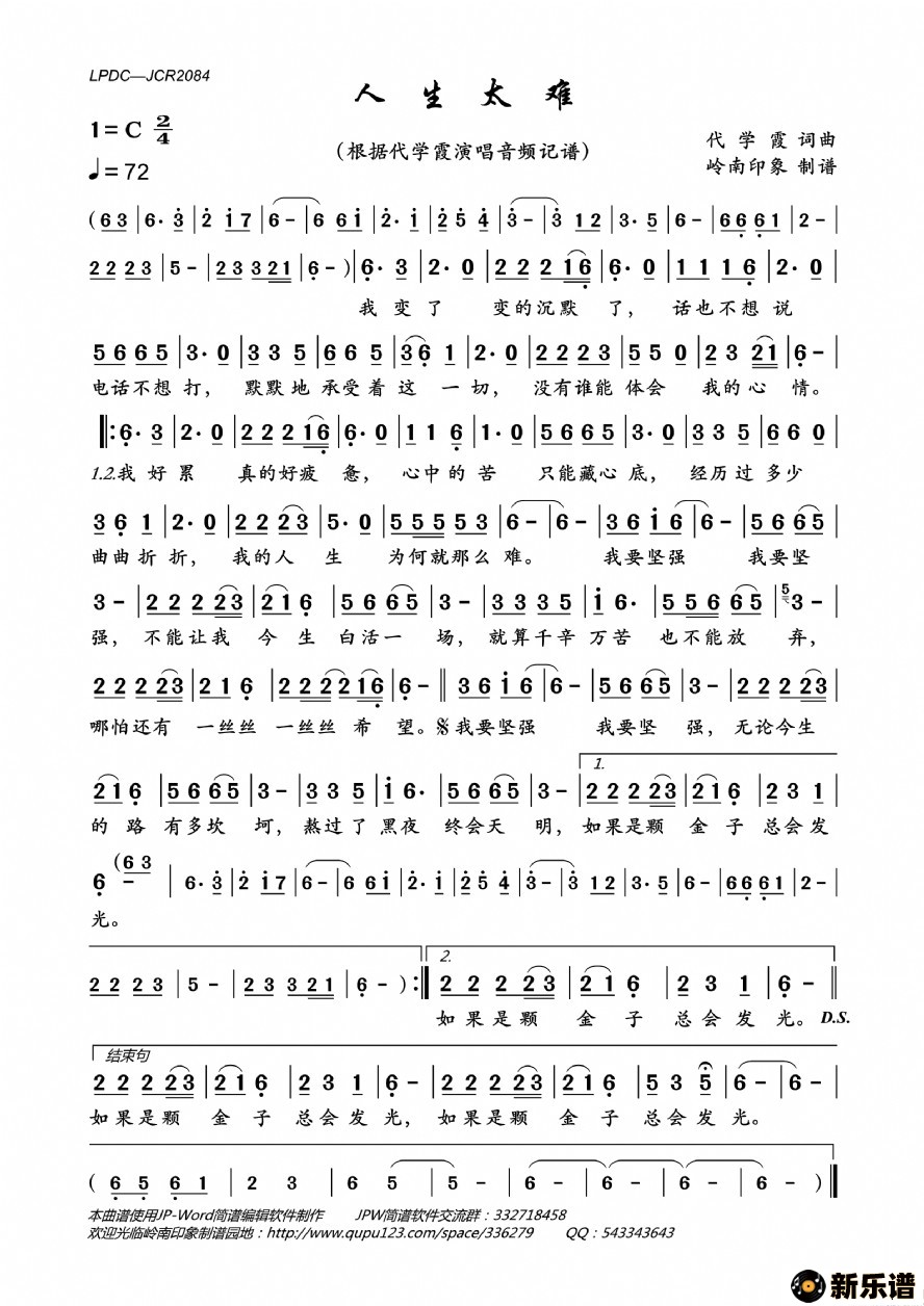 代学霞演唱的人生太难歌词,人生太难简谱.