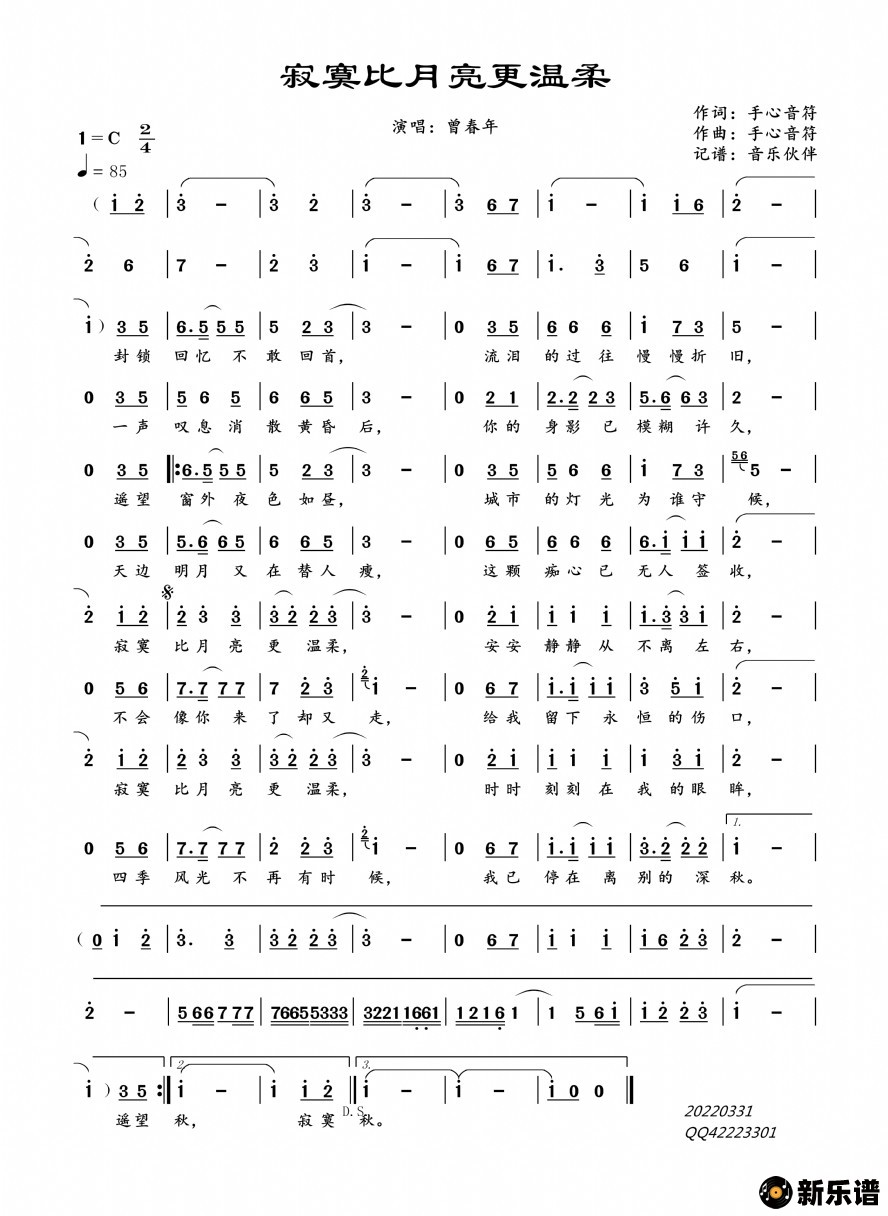 曾春年演唱的寂寞比月亮更温柔歌词,寂寞比月亮更温柔简谱.