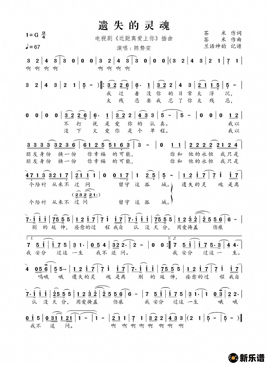 《遗失的灵魂(电视剧《近距离爱上你》插曲)》简谱 陈势安-兰语神韵制谱