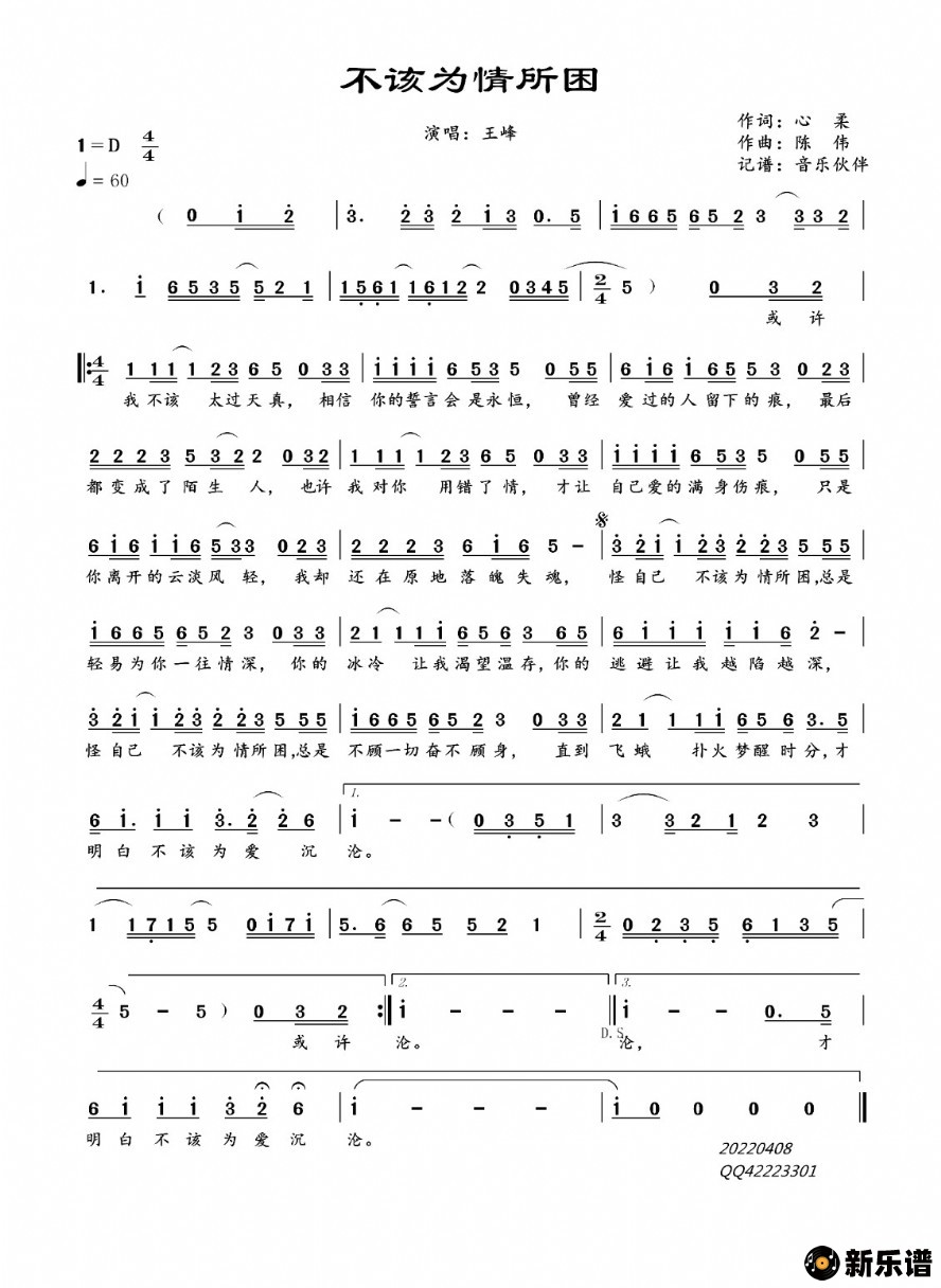 王峰演唱的不该为情所困歌词,不该为情所困简谱.