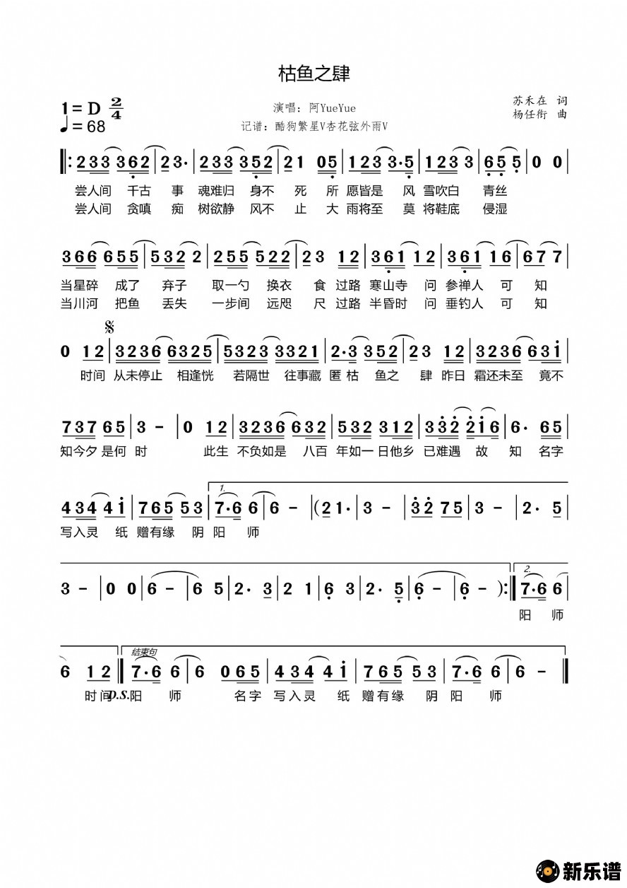 阿YueYue演唱的枯鱼之肆歌词,枯鱼之肆简谱.