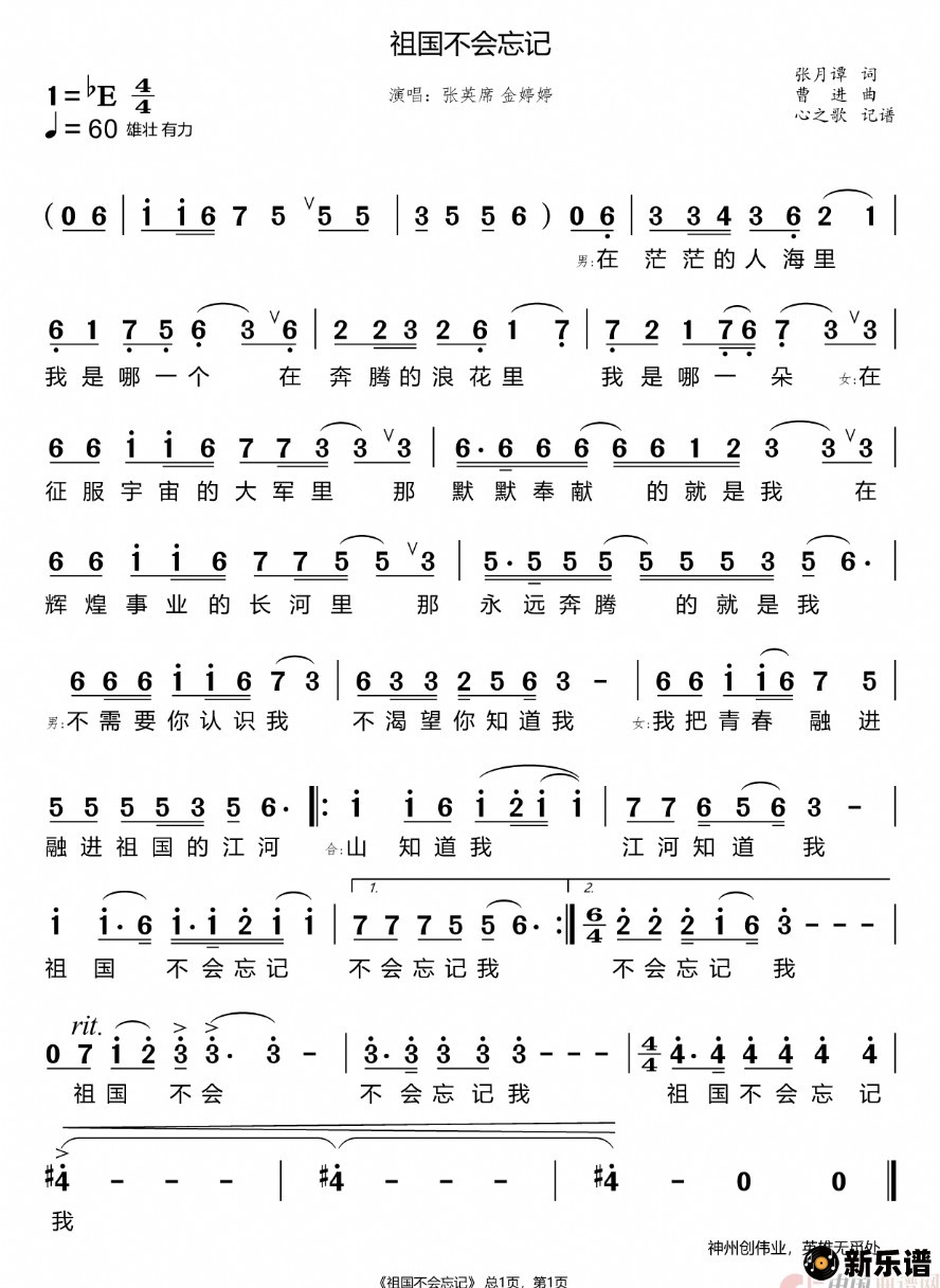《祖国不会忘记》简谱 张英席/金婷婷-心之歌制谱