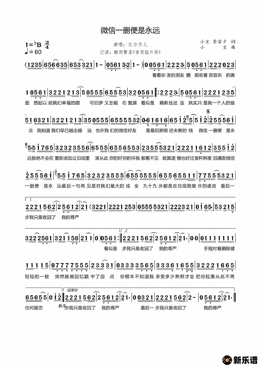 《微信一删便是永远》简谱 北方丹儿-杏花弦外雨制谱