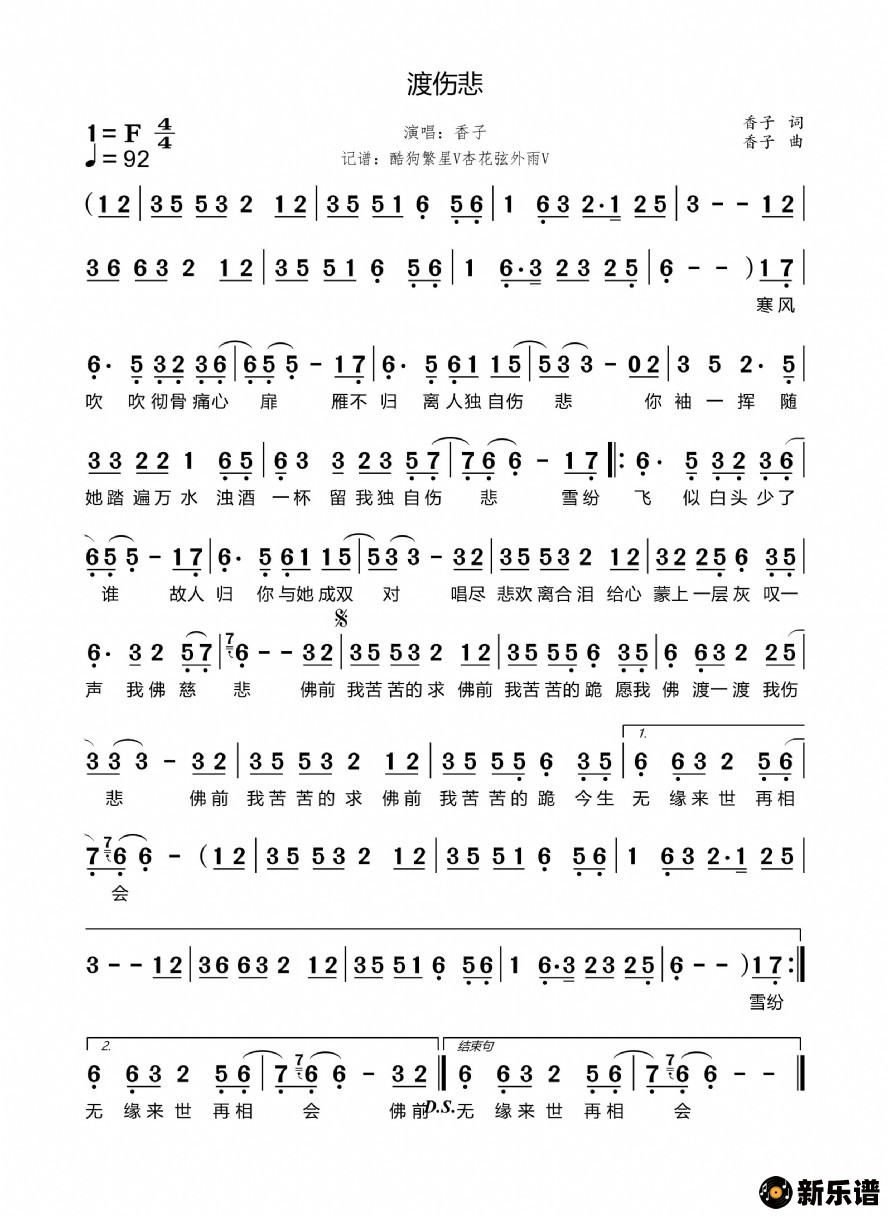 香子演唱的渡伤悲歌词,渡伤悲简谱.