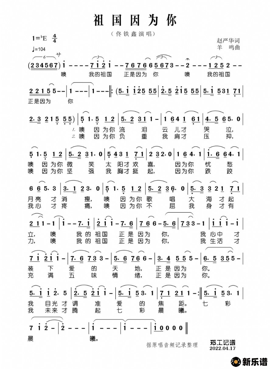 《祖国因为你》简谱 佟铁鑫-郑工制谱