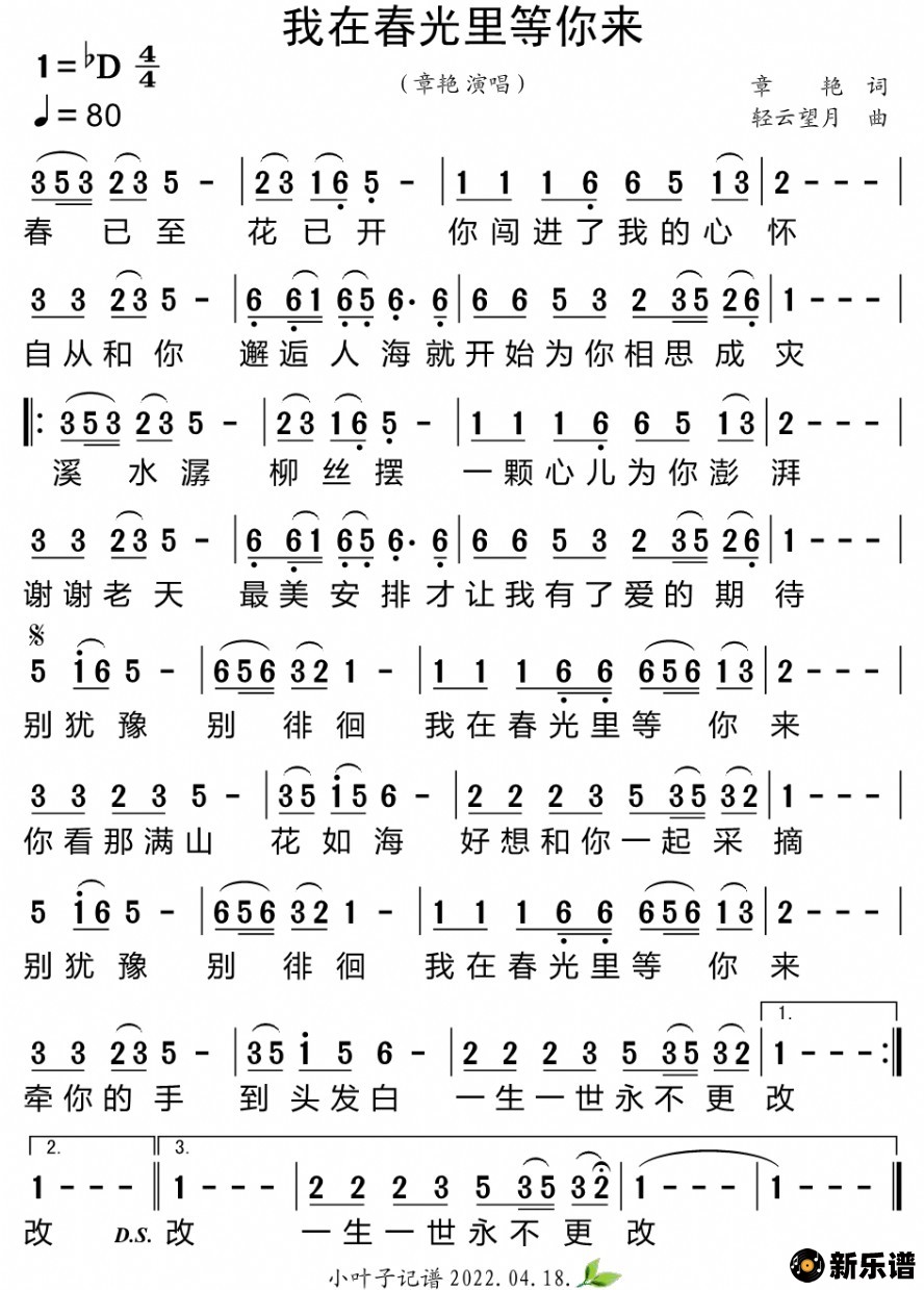 《我在春光里等你来》简谱 章艳-小叶子制谱
