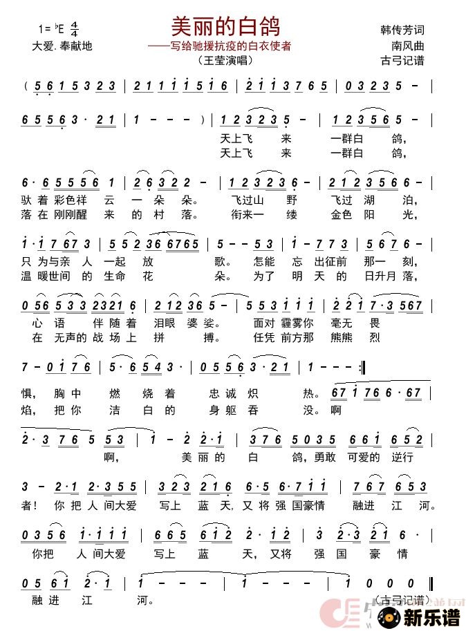 《美丽的白鸽—写给驰援抗疫的白衣使者 》简谱 王莹-古弓制谱