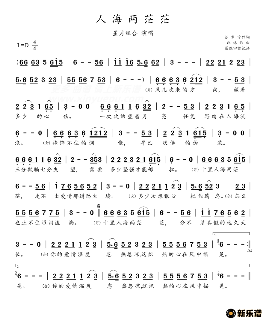 星月组合演唱的人海两茫茫歌词,人海两茫茫简谱.