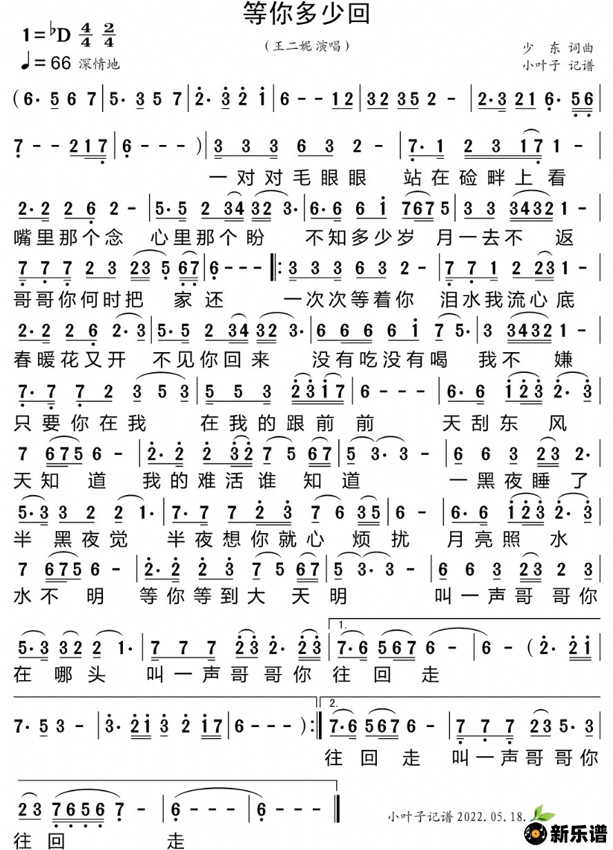 《等你多少回》简谱 王二妮-小叶子制谱