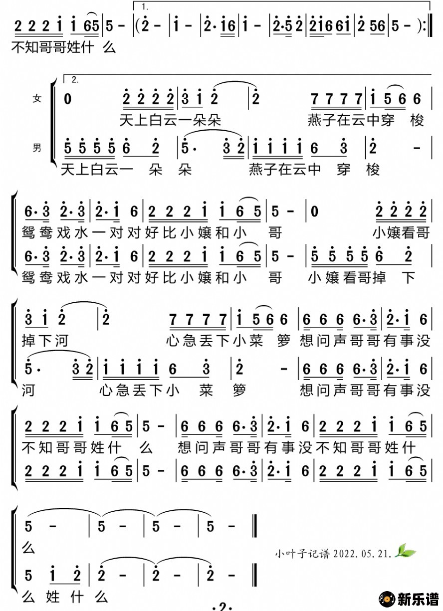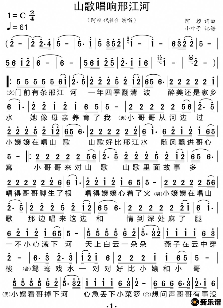 《山歌唱响邢江河》简谱 阿赖、代佳佳-小叶子制谱