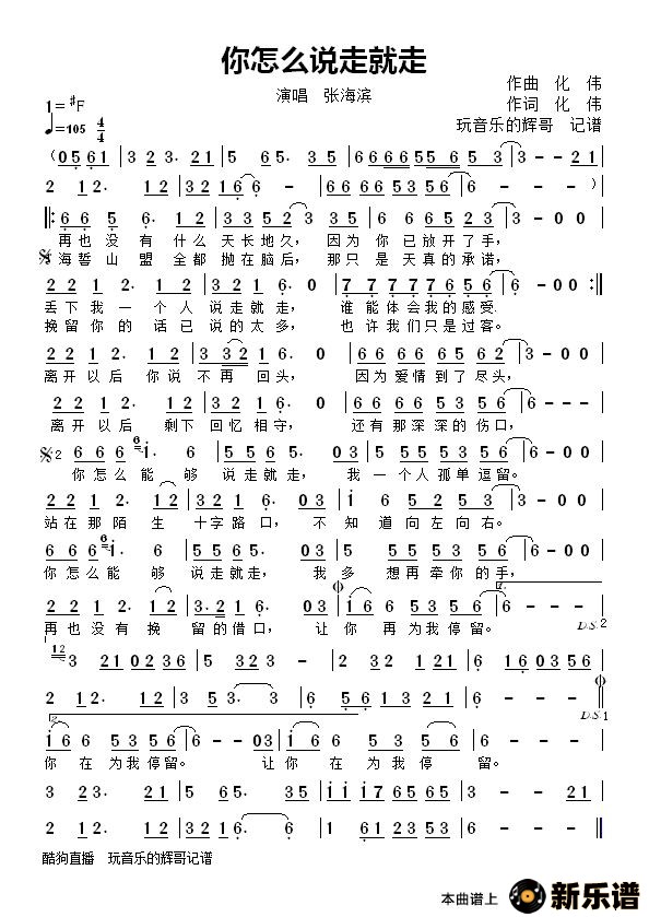 你怎么说走就走/演唱 张海滨 相关曲谱