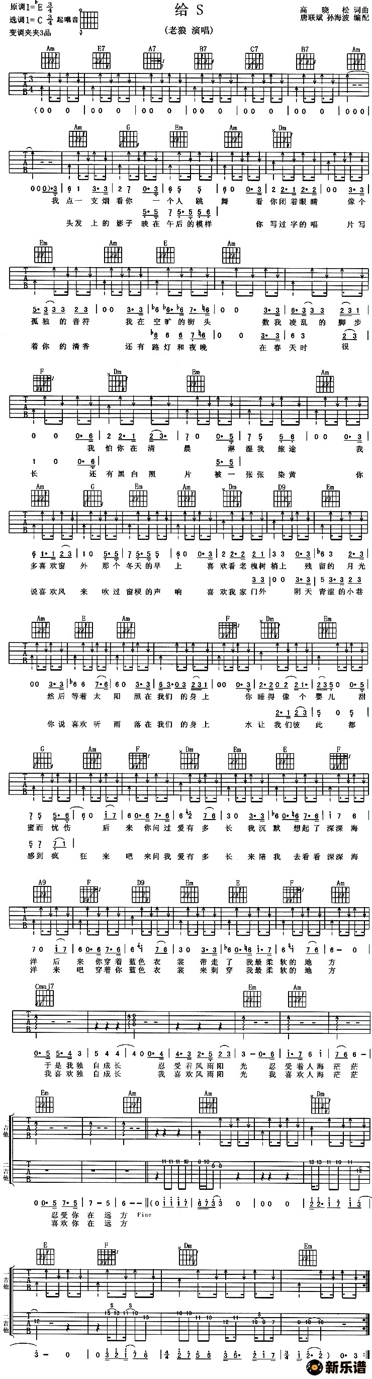 《给S》吉他谱 老狼