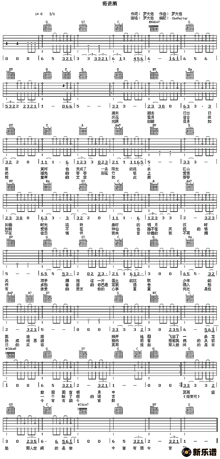 演唱的将进酒歌词,将进酒吉他谱.