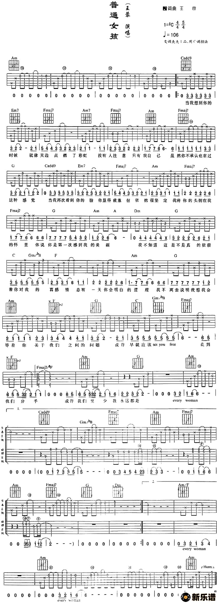 演唱的普通女孩歌词,普通女孩吉他谱.